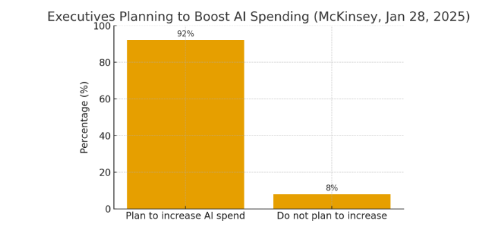 A very large share of executives report plans to increase AI investment — 92% of executives surveyed by McKinsey expect to boost AI spending in the near term, underlining the enterprise-level push toward automation and augmentation. (McKinsey & Company)