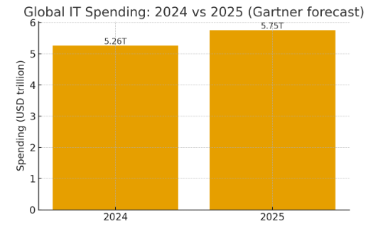 Global IT spending and enterprise priorities show clear momentum toward AI, cloud, and security. Gartner forecasts global IT spending of $5.75 trillion in 2025, reflecting strong growth in corporate tech budgets. This expansion is concentrated in cloud, AI-enabled applications, and security investments.